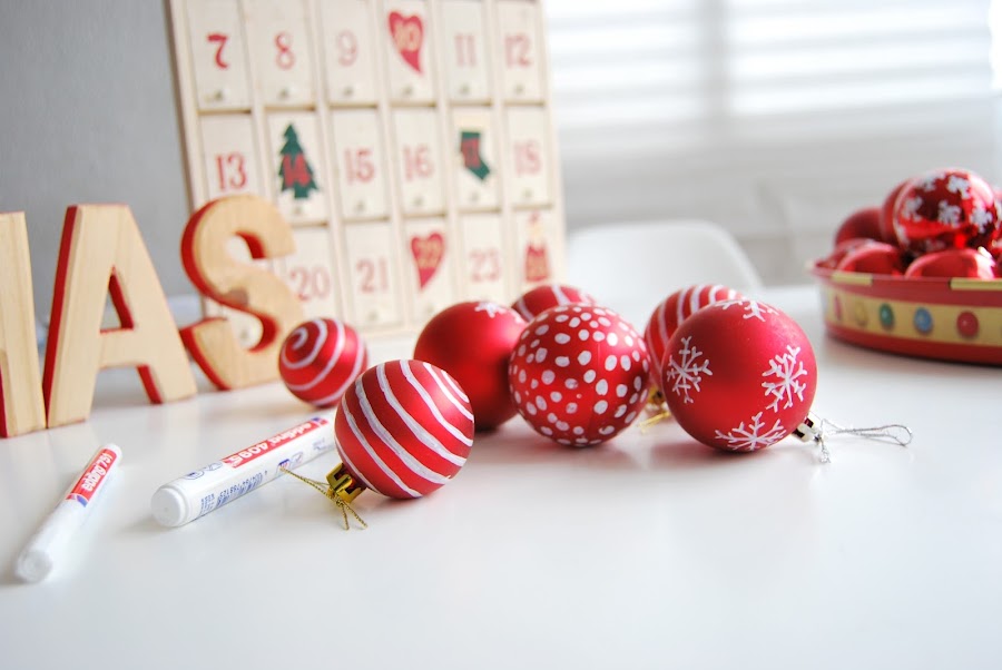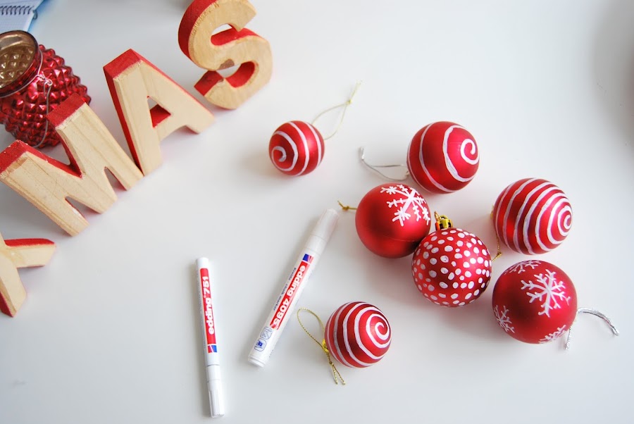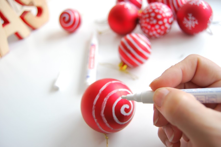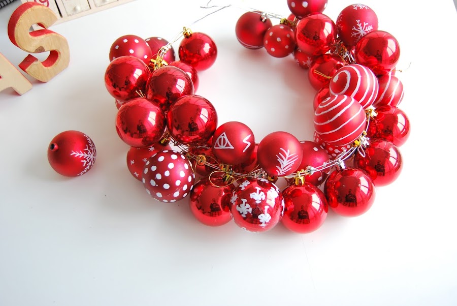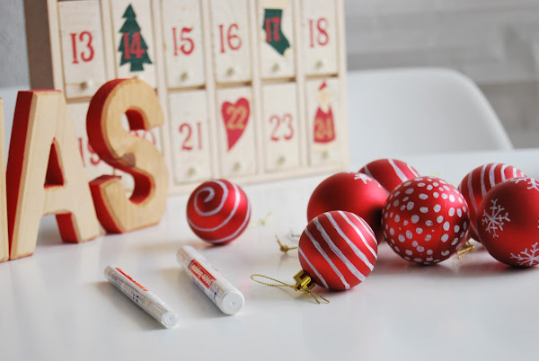 Tengo que reconocer que una de las cosas más divertidas de crear un tutorial es ver cómo se va transformando y de la idea inicial de una corona de bolas rojas que tenía el año pasado clarísima en la cabeza, este año evolucionó a rojo y blanco. Supongo que por alguna influencia de Pinterest, no lo tengo muy claro, pero era evidente que estas bolas estaban pidiendo a gritos un poco de rotulador de tiza (sí, lo sé, este es otro capítulo más de So Sunny y su rotulador de tiza...).