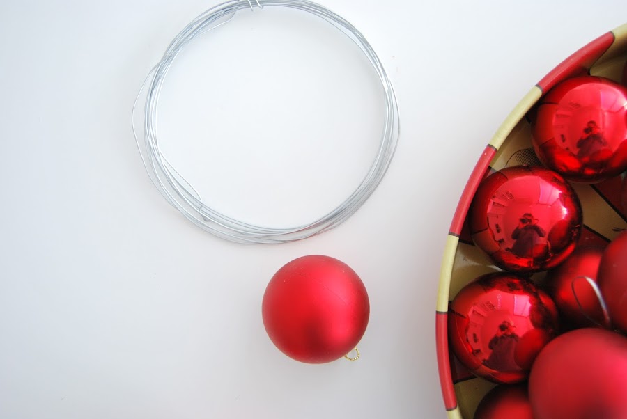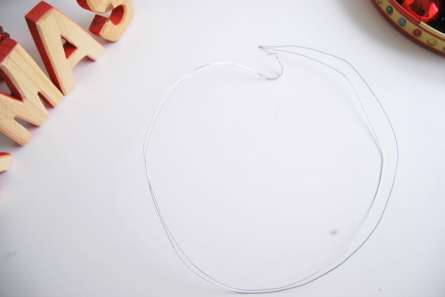 El resto es muy fácil, preparar un alambre en forma de círculo (que sea algo grueso o al menos darle un par de vueltas, si no, la corona acabará combada), e ir colocando las bolas alternando una pintada y una sin pintar, alguna grande, otra más pequeña... hasta llenar el alambre.