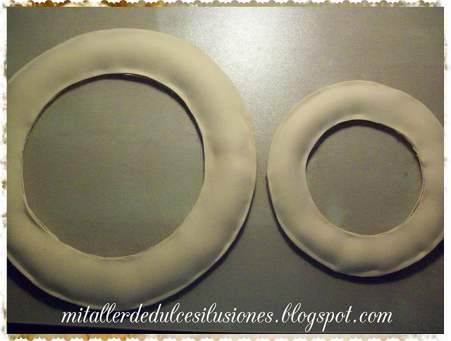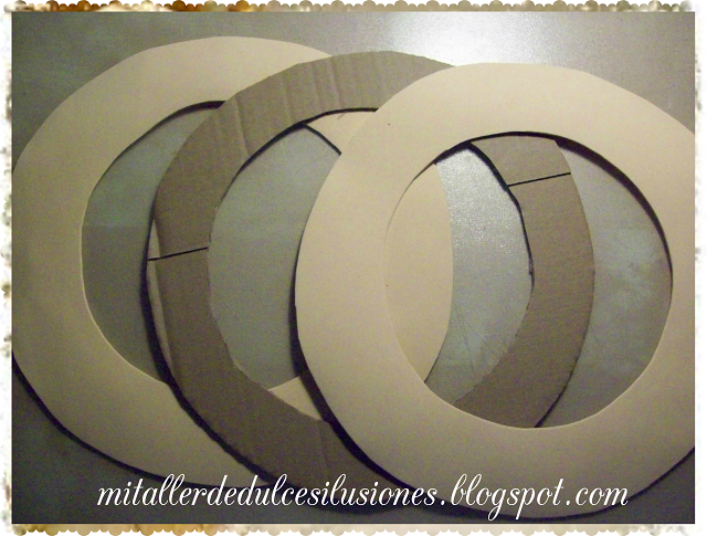 2.Podéis compra la corona de corcho si queréis,pero como consiste en hacerlo yo casi todo,pues en mi caso me fabrique mi propia corona,corte dos círculos de goma eva o foami de 30 cm de diámetro y uno de cartón del mismo diámetro,yo elegí goma eva de color béis por que no quería que se notase con los encajes.Le recortáis un círculo central de 19cm de diámetro a cada uno de los círculos que tenéis.