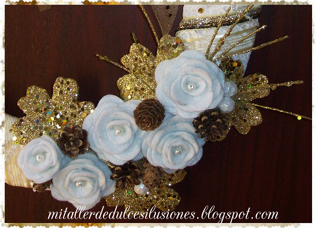 6.Como decoración yo le puse a la corona unas rosas hechas de fieltro por mí,las hice como hice las de papel vegetal,veréis que sencillas de hacer si pincháis AQUÍ ,le añadí unas hojas hechas con goma eva o foami de purpurinas ,unas piñas que cogí en el campo y perlas.