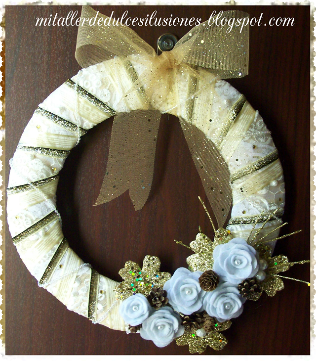 Y en la parte de arriba le puse una gran lazada,no os olvidéis ponerle una cinta o cordón dorado parta poder colgarla.