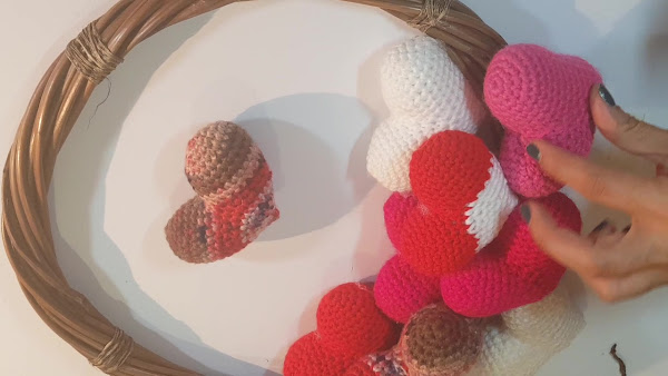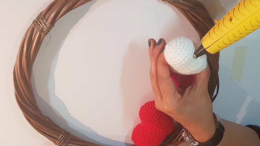 Tomamos la corona y colocamos los corazones en el orden deseado y lo pegamos con la silicona caliente.