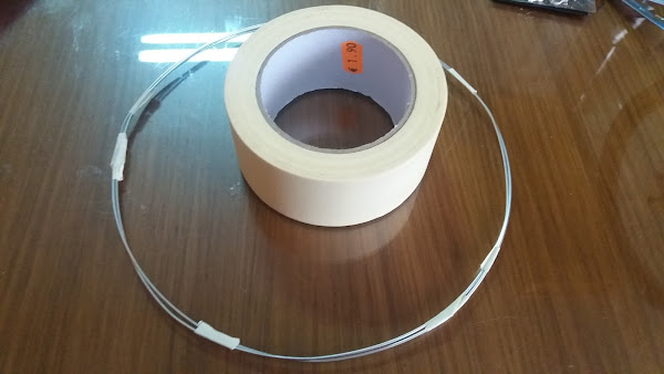 En lugar de recortar un trozo de cartón, o juntar papel hasta conseguir un circulo, use , como veis este alambre. Como no era suficientemente ancho, le añadí otra circunferencia mas de alambre, con cinta de carrocero los fui uniendo.
