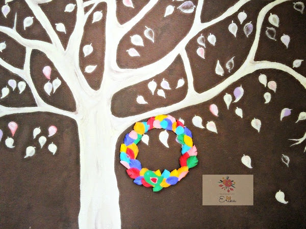 Sigo decorando la habitación, está vez le hice una colorida corona de plumas hechas con papel la cual ha encantado , de lejos parece que fueran plumas reales , el efecto del corte fino hace que se vean tan bonitas :)
