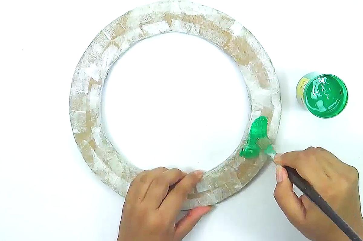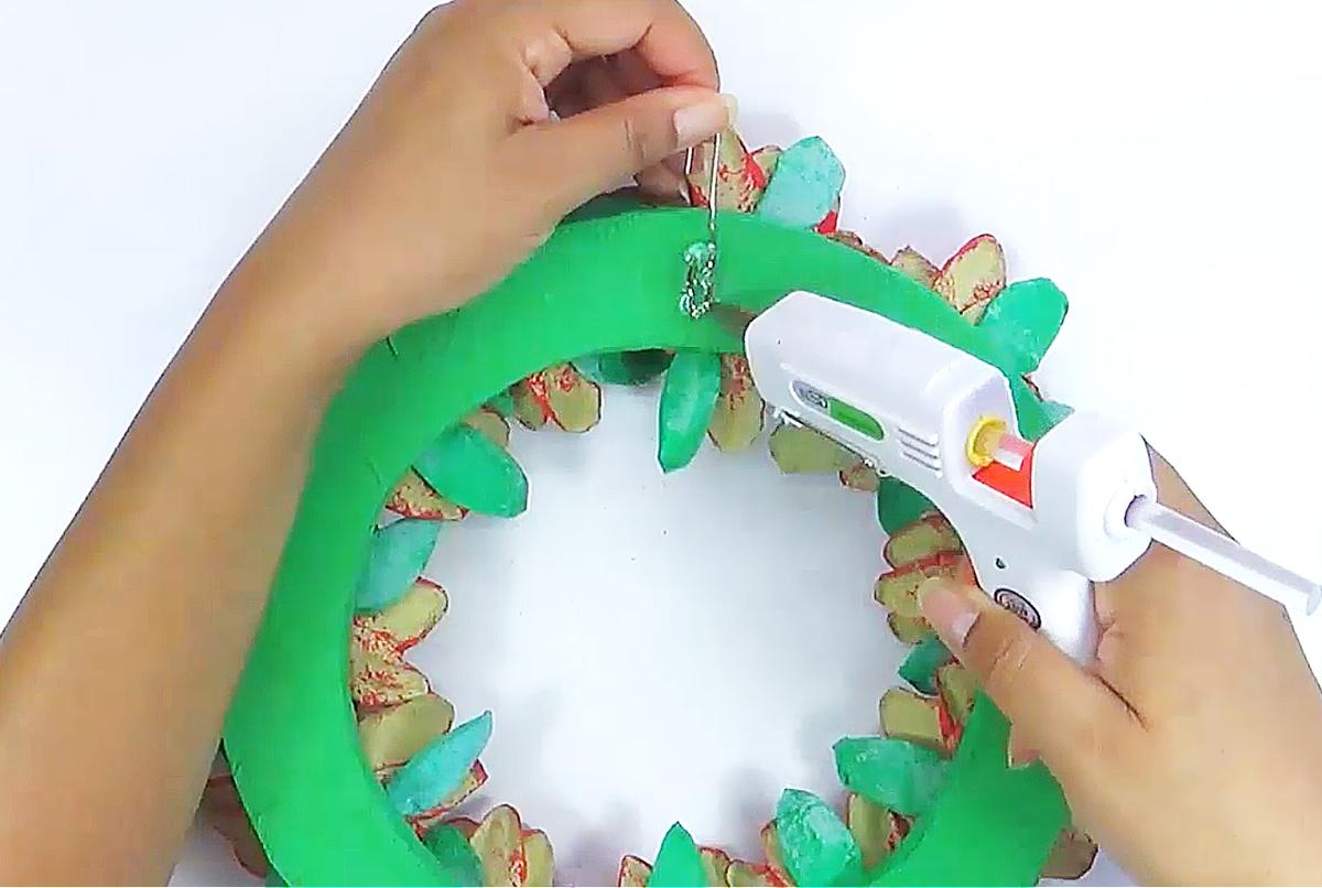 Para colgar la corona, pega con bastante silicona caliente, un clip de papel semi abierto. Y LISTO!