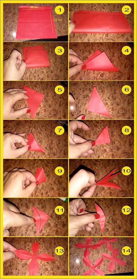 Cortamos un cuadrado de papel seda de color rojo , (20cm x 20 cm) las medidas , como siempre variaran dependiendo del tamaño que las queramos (Img.1) y lo doblamos por la mitad (Img.2), del rectángulo que nos queda , doblamos por la mitad haciendo así un cuadrado (Img.3).