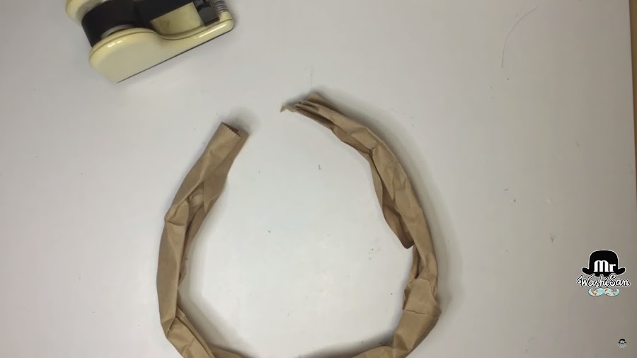 Lo primero que hacemos es preparar una estructura poniendo un alambre de aluminio en el centro de unas hojas de papel kraft de papel reciclado de bolsas de basura de supermercado. Le damos la forma circular y pegamos los extremos.