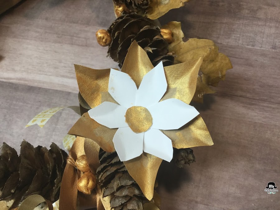 Y crearemos unas flores de papel kraft reciclado pintando los bordes de dorado y cartulina blanca.