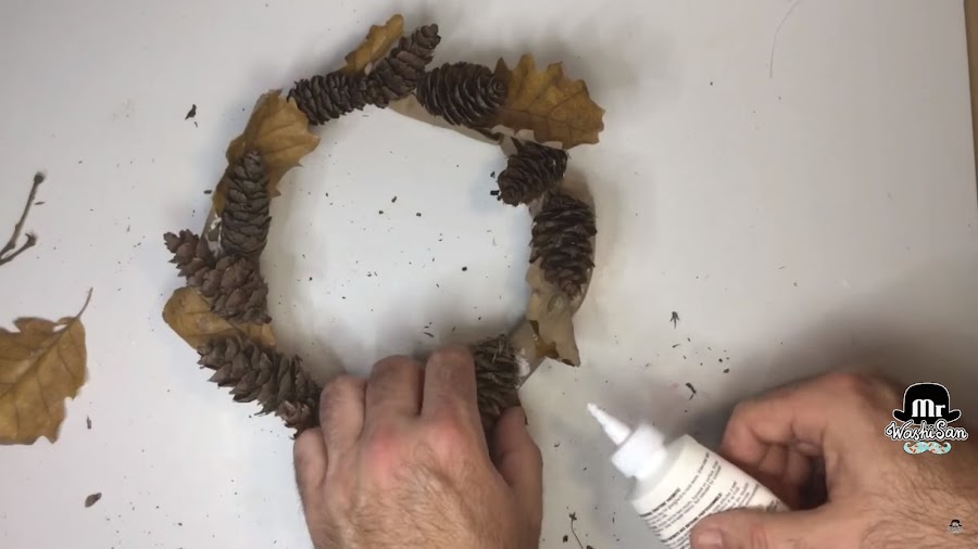 Pegamos también las hojas y piñas secas que hemos recogido del bosque o incluso de un parque. Podemos usar cola, pero también una pistola de silicona caliente.