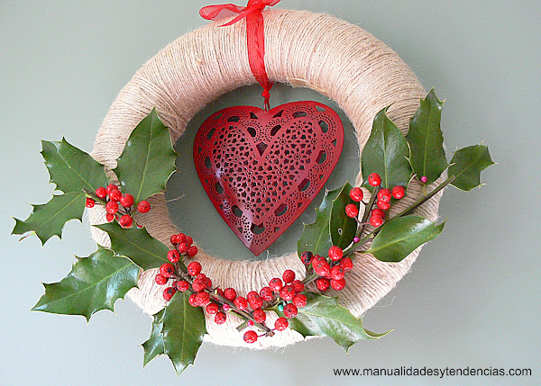 Para terminar colocamos nuestro corazón rojo de metal en el centro de la corona y lo sujetamos usando un bonito lazo rojo. Si no tenéis este corazón podéis escoger otro adorno que tengáis por casa en los mismos tonos para que conjunte con los frutos del acebo.