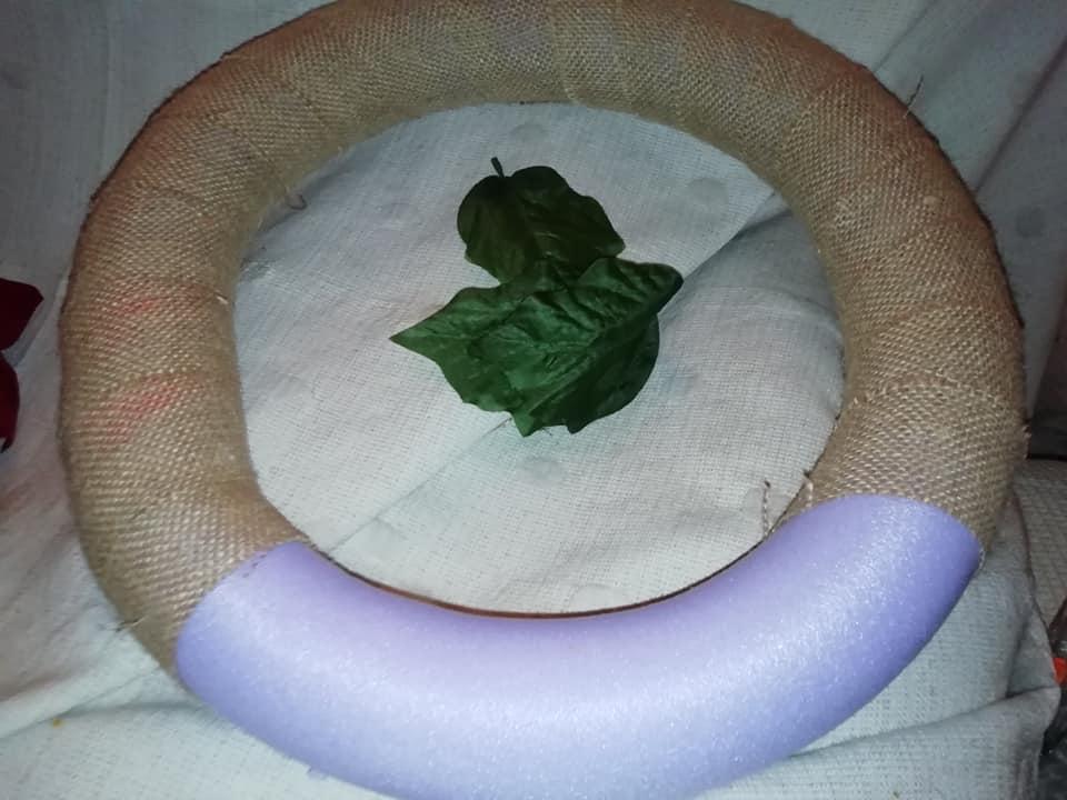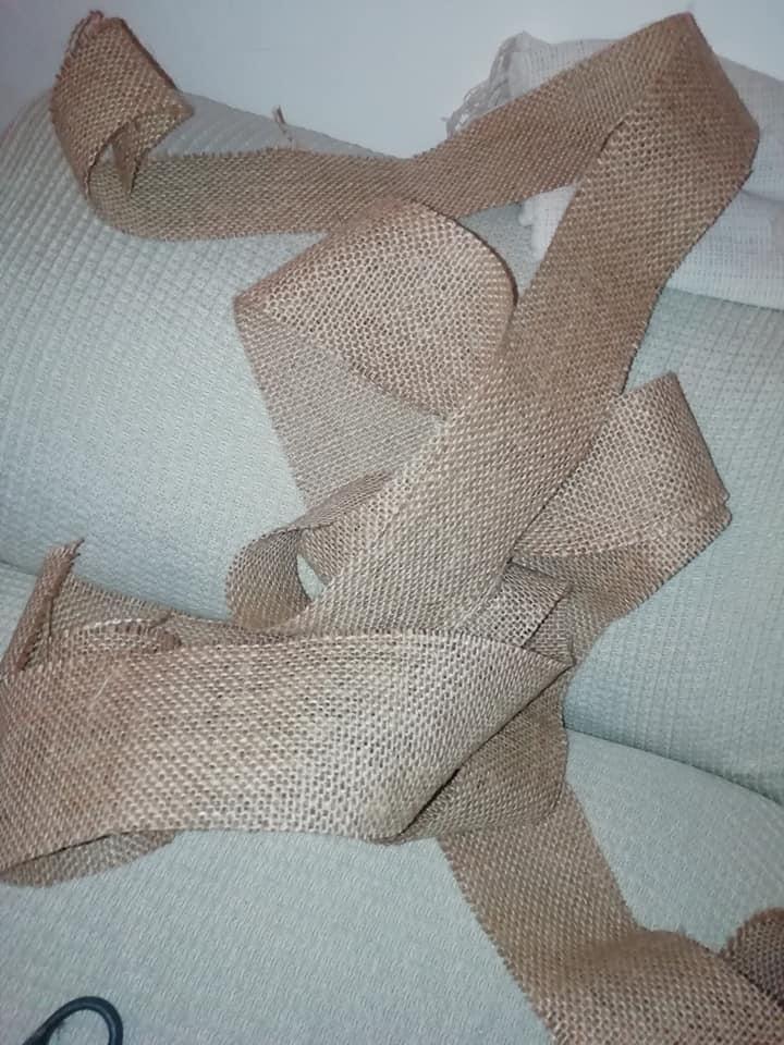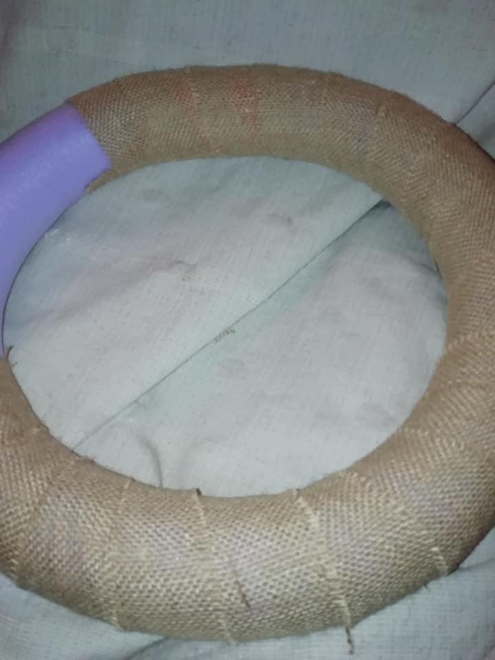 A continuación tomamos el rollo de tela de saco y lo enrollamos en todo el aro sin que queden espacios libres. Para que no se suelte, pegaremos el inicio con pegamento caliente al aro. En esta ocasión , yo calculé mal y me quedé un poco corta con el rollo de tela de saco y me faltó para cubrirla entera, pero como era domingo no había nada abierto y me las tuve que ingeniar para que no se notara, y de hecho no se nota.