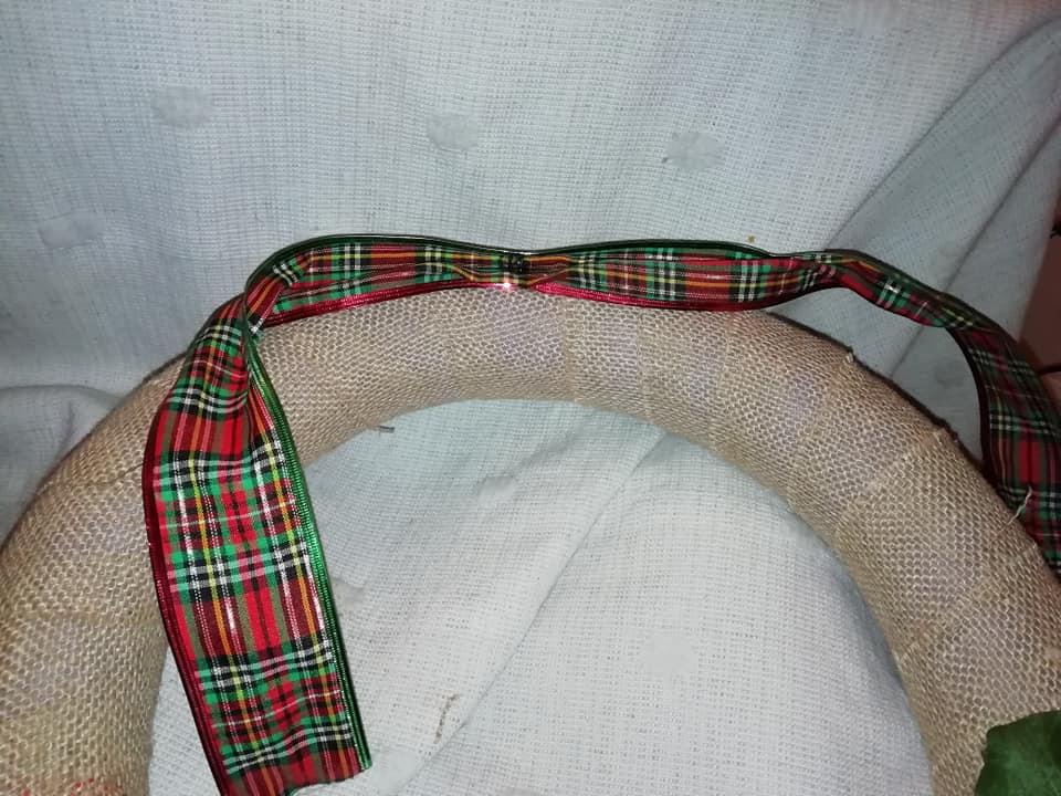 El toque final. Cortaremos nuestra tira de tela, ya sea de cuadros o de cualquier otro color navideño y haremos un lazo lo más bonito posible. A continuación lo pegaremos en la parte de arriba de la corona. Quedando así: