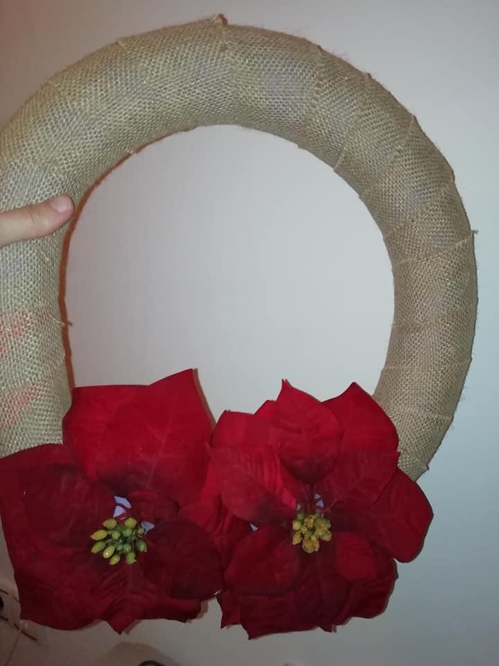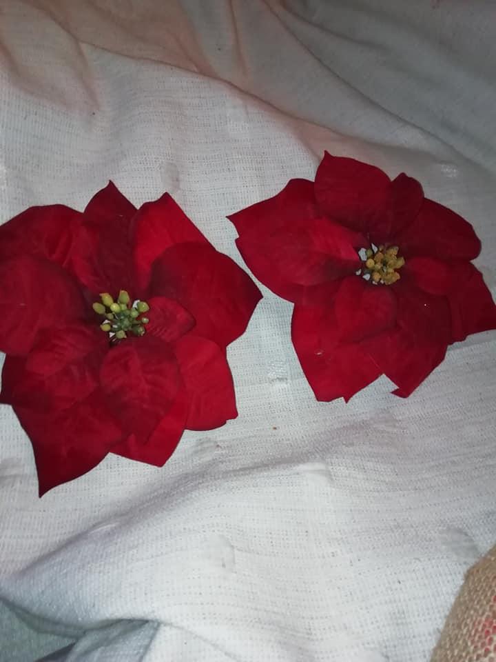 Ahora pasaremos a pegar las flores. Yo he cogido dos flores de pascua grandes que cubren todo el espacio que se quedó sin rellenar de tela. Después de pegar las flores, pegaremos las hojas verdes artificiales.