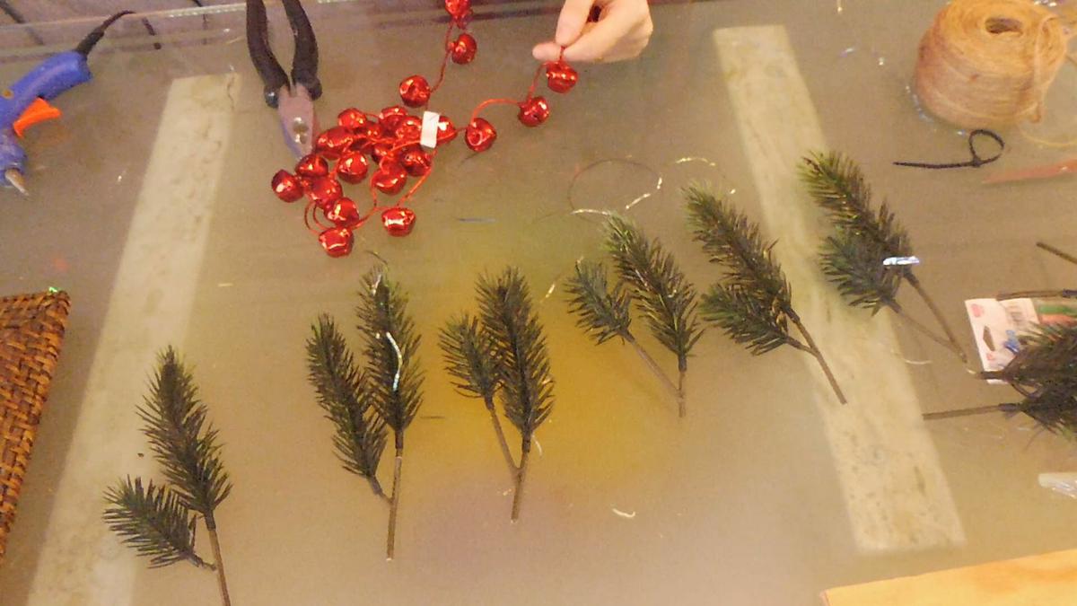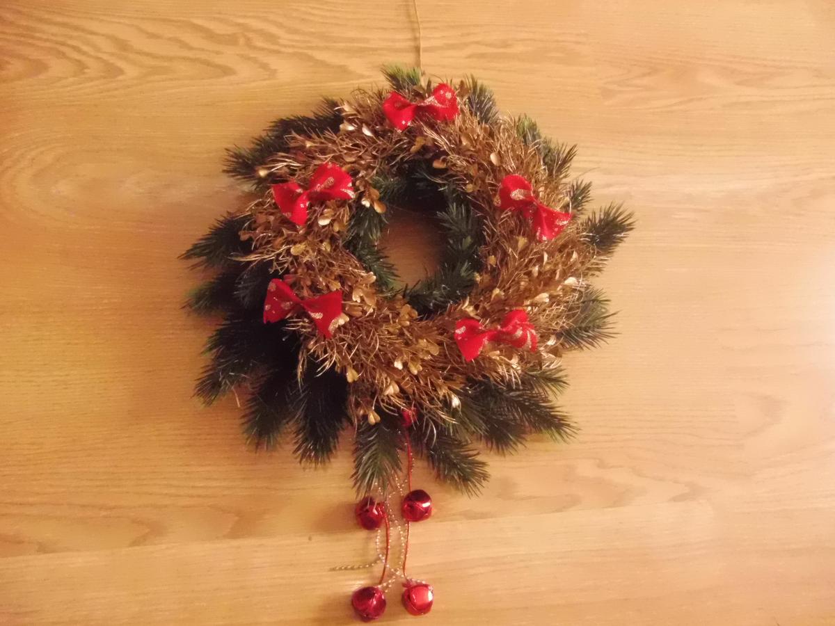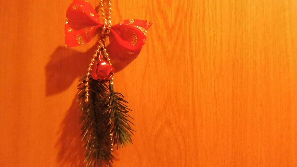 Tan solo unas ramas, unos cascabeles, un lazo y un cordóncillo de perlitas doradas. No tiene más…y todo con decoraciones rotas o que simplemente no uso año tras año!