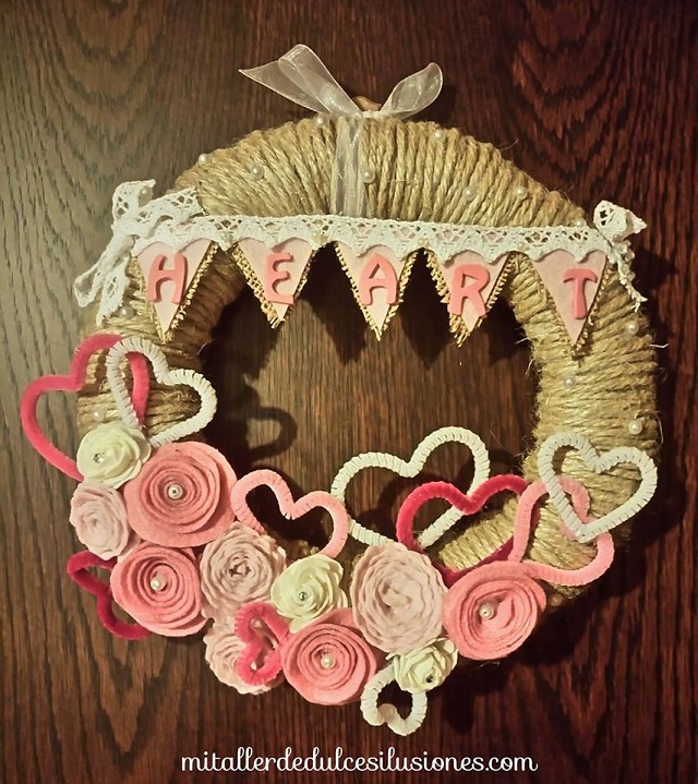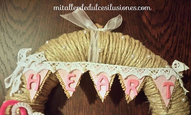 6. Pegáis todas vuestras decoraciones en la corona ,donde más os guste,sacar vuestra imaginación a pasear que siempre es divertido.Yo he añadido una guirnalda de banderitas decoradas con arpillería,fieltro y encaje y donde he puesto la palabra que más me gustaba,la pegáis también ,ponéis una lazada arriba y fin,ya tenéis lista vuestra corona de San Valentin ,para la puerta o cualquier rincón que os guste.Sabéis a mi me parece monísima con el nombre de una niña para la habitación de nuestras peques.
