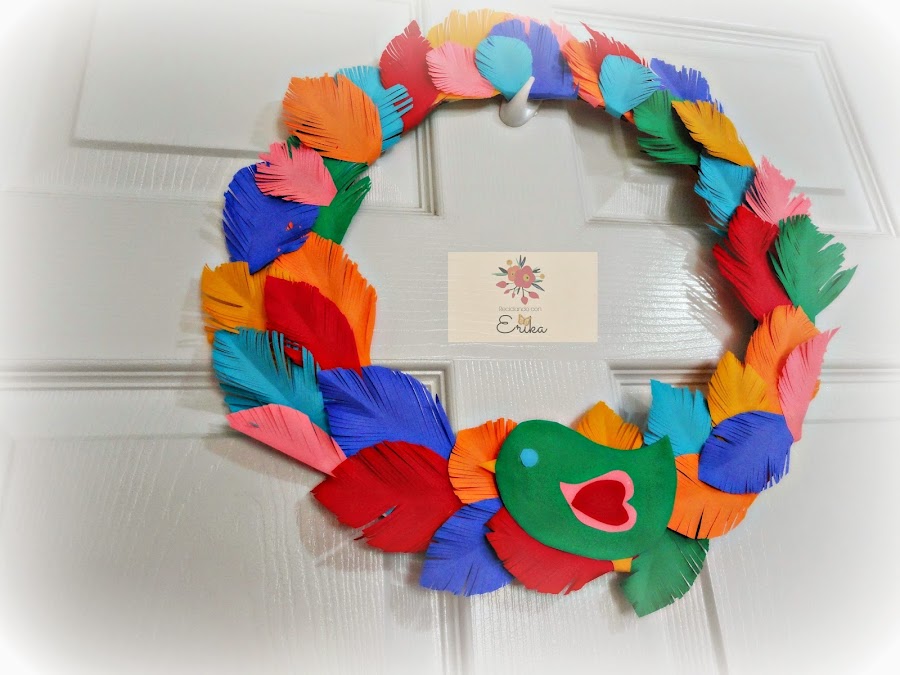 Sigo decorando la habitación, está vez le hice una colorida corona de plumas hechas con papel la cual ha encantado , de lejos parece que fueran plumas reales , el efecto del corte fino hace que se vean tan bonitas :)