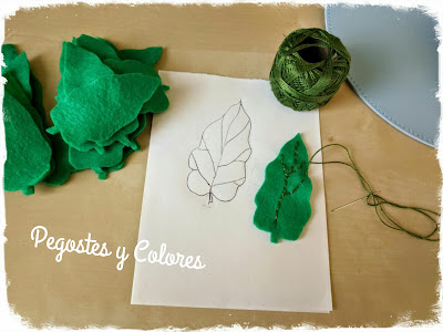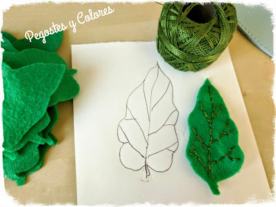 2.- Le separo el papel freezer despues de recortar cada pieza (yo guardo esos papeles porque se puede reutilizar para cortar mas hojas) y les bordo con unas simples nervaduras con hilo perle verde olivo, para que resalten.