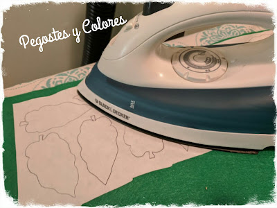 1.- Dibuje mi hoja basandome en una foto de hojas de gerberas y la pase en papel freezer (papel de carnicero con goma), el cual se plancha con el lado de la goma hacia abajo sobre el fieltro. Esto lo hago para recortar de forma mas precisa mis piezas, pero si no tienes de este papel, simplemente pasa los dibujos al fieltro y recorta. Es mejor poner un pañuelo protector antes de pasar la plancha, para que no se le peguen a la base restos de fieltro. En la foto ya habia planchado pero en la prisa por hacer la foto, olvide poner mi protector.