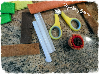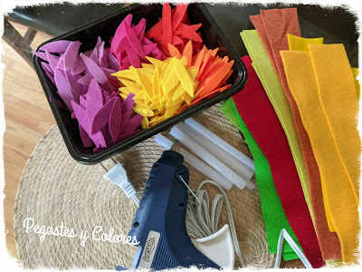 1.- Cortamos varias tiras de 5cm de ancho de fieltro para los tonos que elijas para los centros de las flores, tiras de fieltro verde de 1 cm de ancho para darle mejor acabado al final a la base de cada flor y rectángulos de 5 cm X 1.3 cm para las hojas de la flor en los tonos de los petalos.