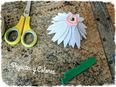 5.- Al termino la flor deberá verse así, no se preocupen por algunas hojas o pétalos si quedaron toscos o muy cuadrados, siempre podemos recortar y redondear mas a nuestro gusto con la flor ya terminada. Ahora tomamos una tira de fieltro verde y pegamos en la base de la flor, damos una vuelta completa y cortamos el sobrante, asegurando al final con una gota mas de silicon. A algunas les hice unos picos por toda la orilla, pero no es tan importante.