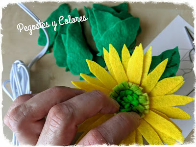 Los centros de las flores y las hojas, si las hice con el fieltro suave de siempre, porque no quise terminarme los tonos verdes que trae ese paquete, que ya estoy planeando otro trabajo con ellos. Y para los centros si recomiento usar del fieltro suave porque es mas facil de manipular y enrollar para darle la forma.