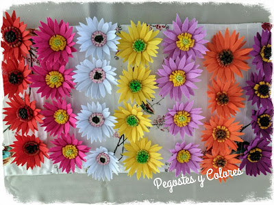 Pero los tonos verdaderos de las gerberas son fuertes y como queria algo nuevo para mi corona, pero en tonos muy alegres y vivos que representen un poco mas al verano, decidi investigar las variedades y hacer algo mas apegado a la realidad.