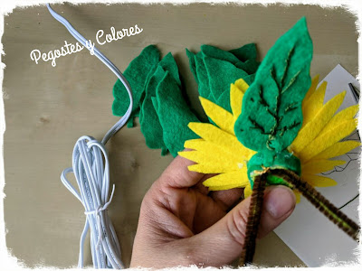 3.- Con la pistola de silicon pego una hoja en cada flor. Tambien le cosi con hilo perle cafe la mitad de un limpia pipas color cafe a cada una de las flores que voy a poner en mi corona para asegurarlas. Esto lo hago para que al cambiar la decoracion sea mas facil ponerlas y quitarlas. Es preferible coser el limpia pipas, para que al acomodar la flor en la corona y enredar el limpia pipas, no se vaya venciendo el silicon, duran mas asi.