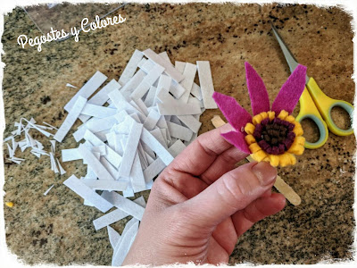 Una vez que hicimos el tono mas oscuro, tomamos el que sigue pegandolo de la misma forma y enrollando una sola vuelta, luego cortamos el sobrante con unas tijeras.