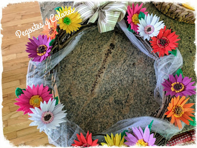 Asi que aqui estan, mis gerberas con la corona de siempre que reciclo todo el ano, cambiandole los adornos y dandole su limpiada cada que la cambio.