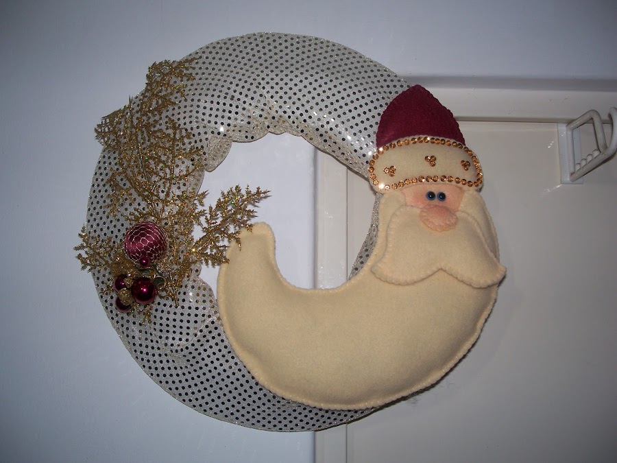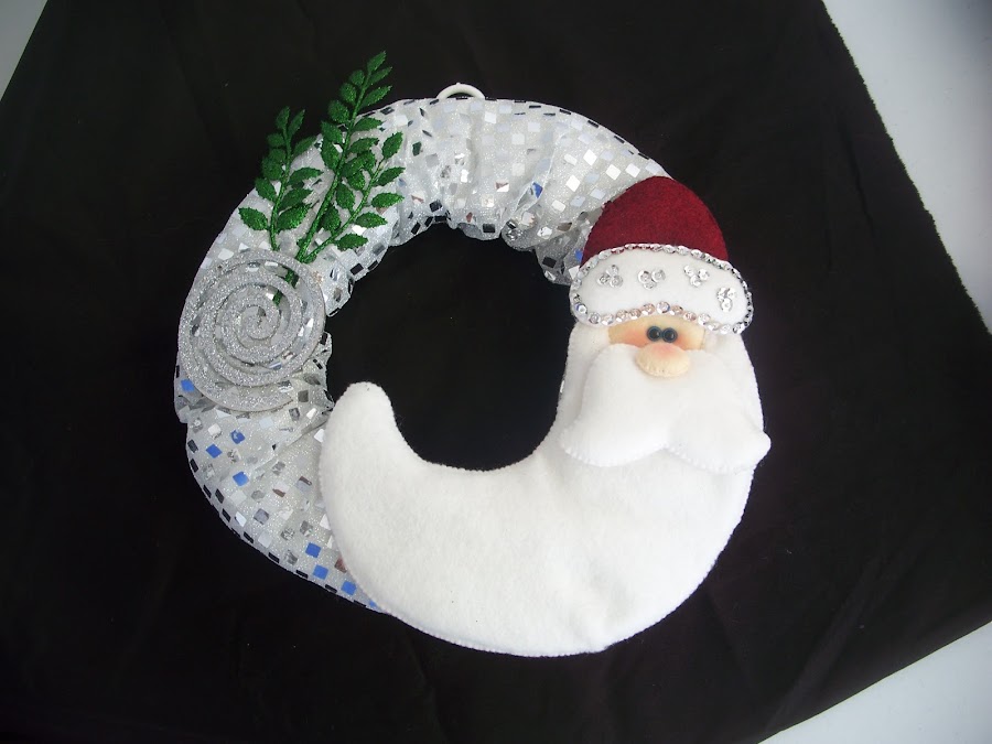 Esta corona tiene el sana de fieltro, la tela de fantasía envolviendo como una funda una corona de unicel a la que se le pega por arriba guata o algodón siliconado como lo conocen en algunos paises, además de esos adornos de picks navideños.?
