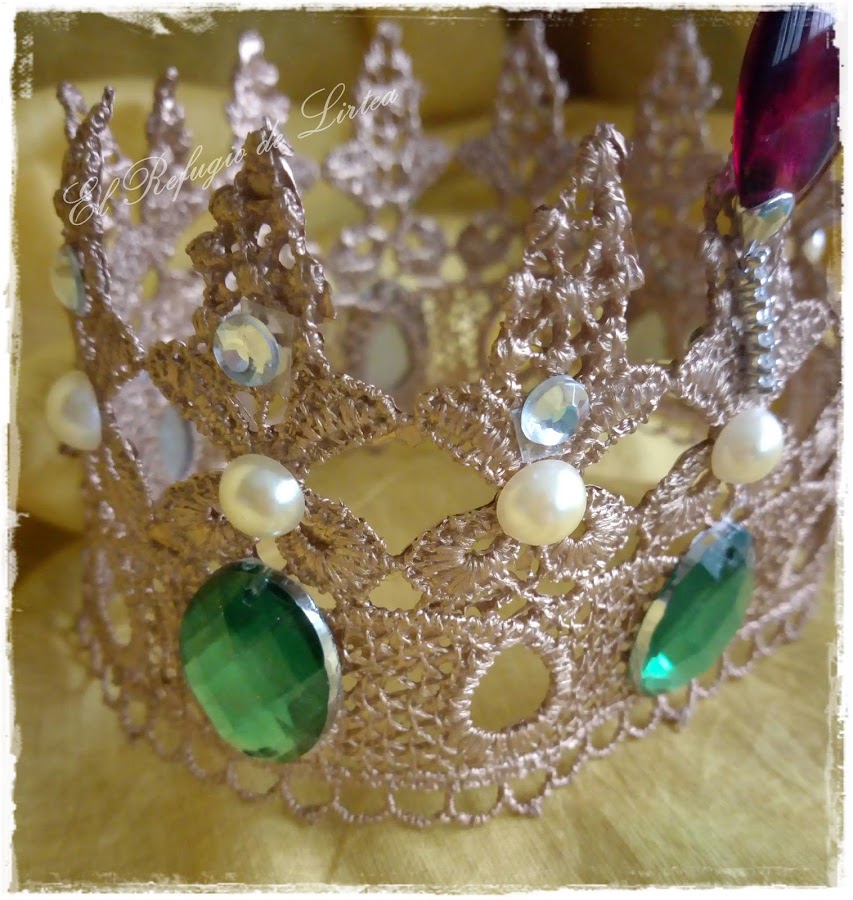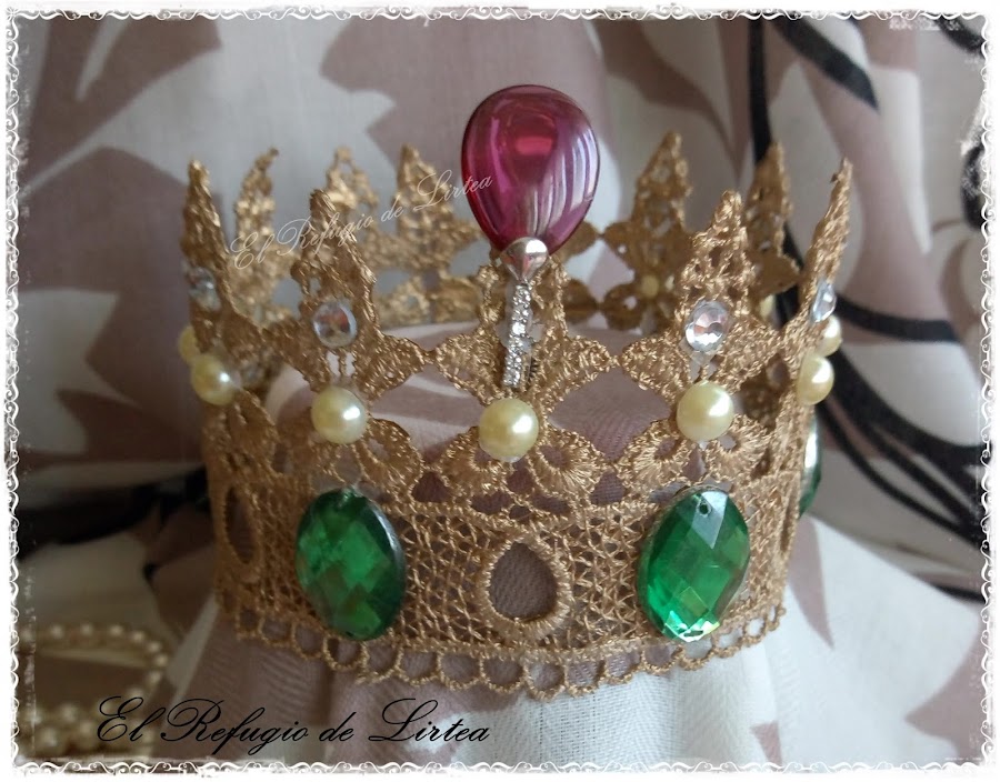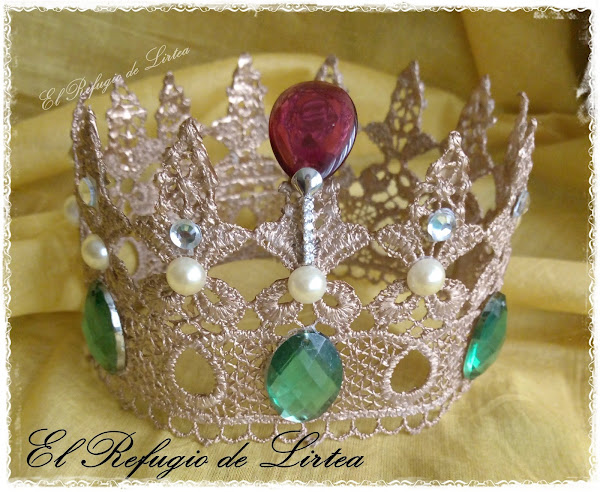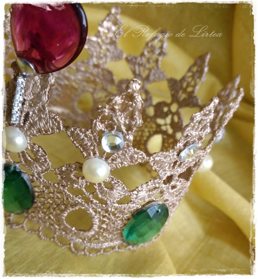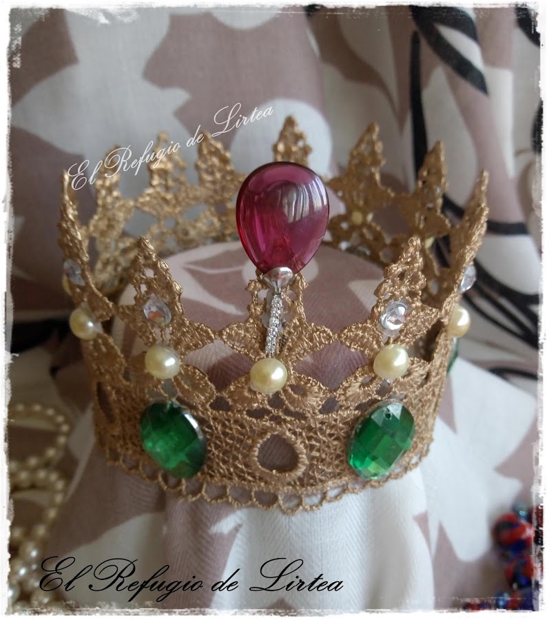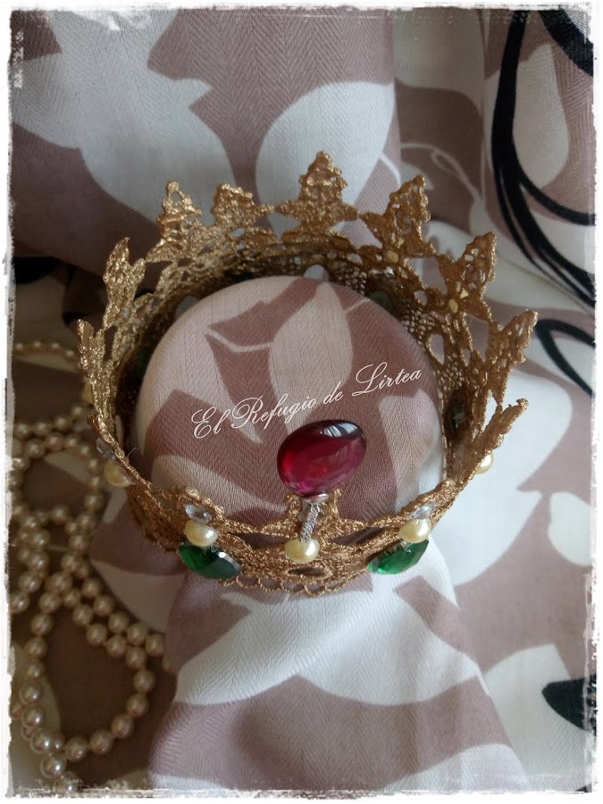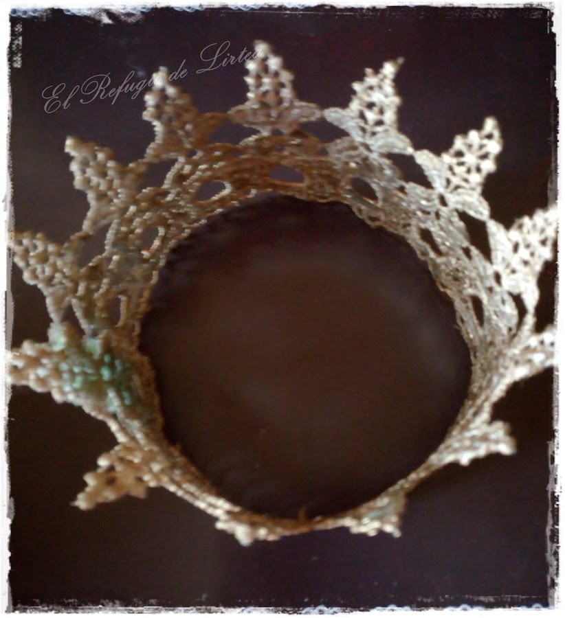 En esta entrada os muestro otro trabajo, digamos casi de reciclaje, porque he utilizado una puntilla de tela y la he convertido en corona.