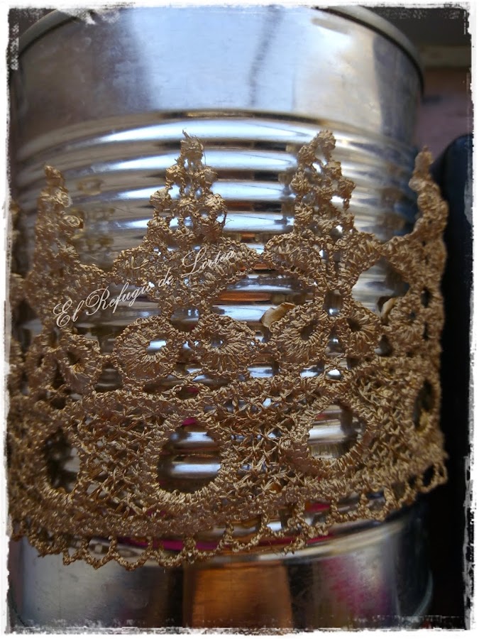 Así que tomé la medida de una lata grande, corté la puntilla y la introduje en la cola mezclada con la pintura y una vez retirada el exceso de cola, la puse sobre la lata para que cogiera la forma redondeada y deje secar.