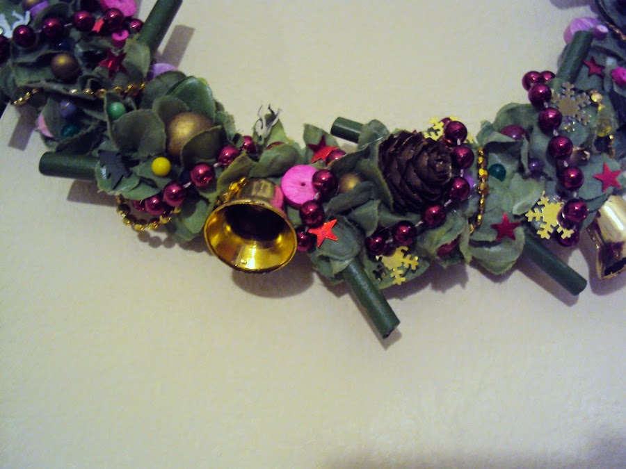 Así que hemos aprovechado cuentas y adornos como en la primera corona, y también una cadena con campanas para darle mayor toque navideño :)