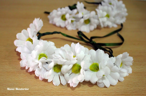 Coronas de flores hechas a mano para unas niñas que van a llevar las arras en una boda. Son medias coronas que se ajustan a la cabeza con un lazo.