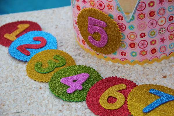 Todas ellas van con números intercambiables del 1 al 9 (bueno, el 6 y el 9 son el mismo) hechos con goma eva brillante y por la parte de atrás llevan una tira de velcro para pegar y despegar con facilidad.