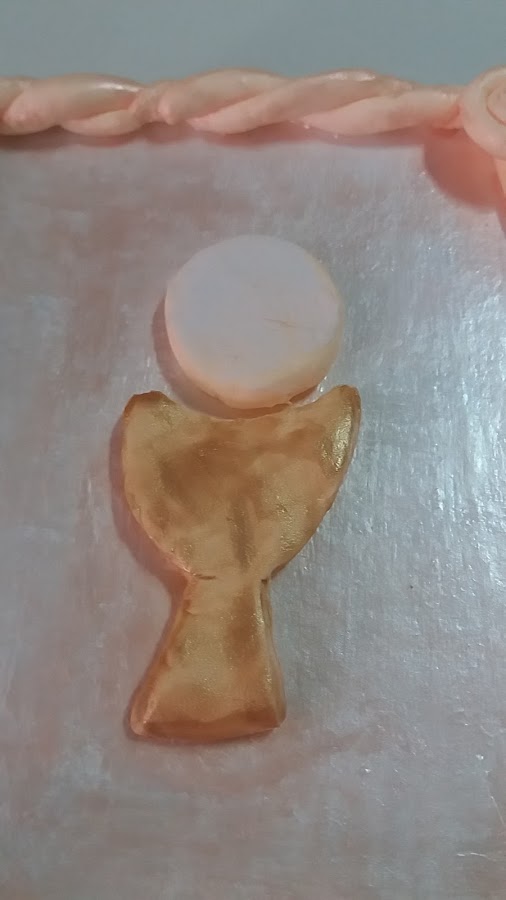 El cáliz lo hice con el estilete, y la Sagrada forma con las manos, hice una bola, la fui aplastando con el dedo y la redondeé también con los dedos. Ahh! lo olvidaba la pinté en blanco, pero a pincel seco.