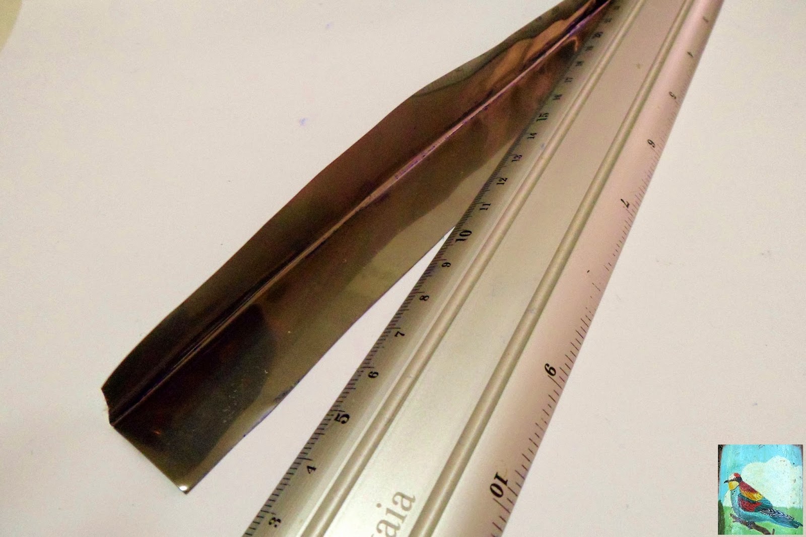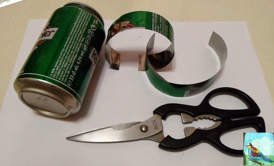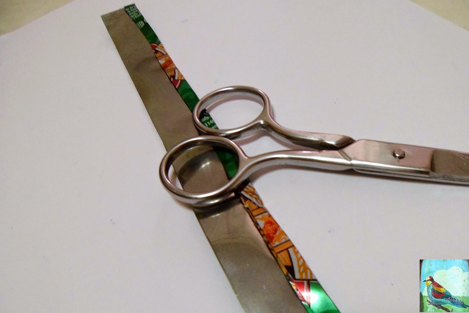 1. Tenemos que abrir la lata con las tijeras y la vamos cortando hasta quedarnos con unas tiras de 2,5 cms de ancho. Para cortarlas rectas medimos con la regla y señalamos con el rotulador. Con una lata deben salirnos unas 3 tiras.