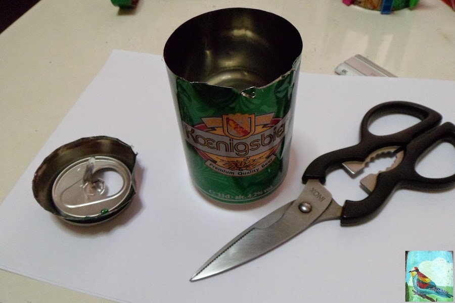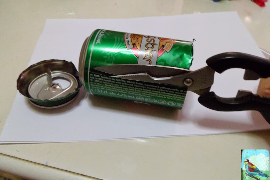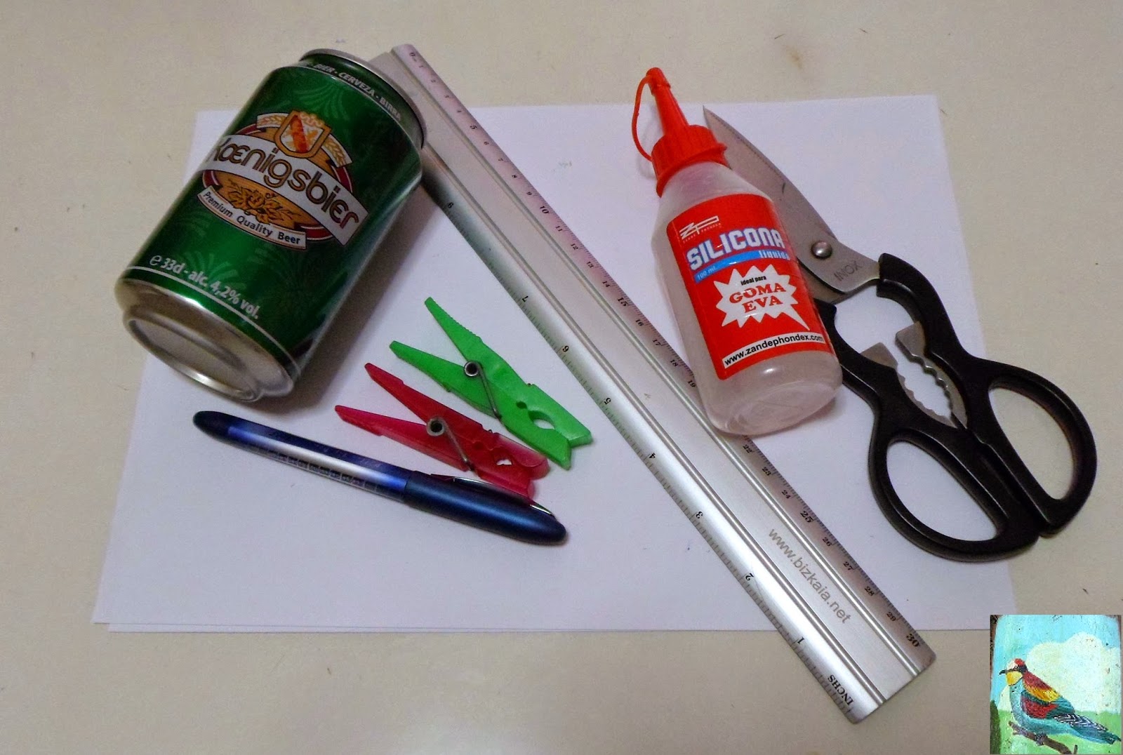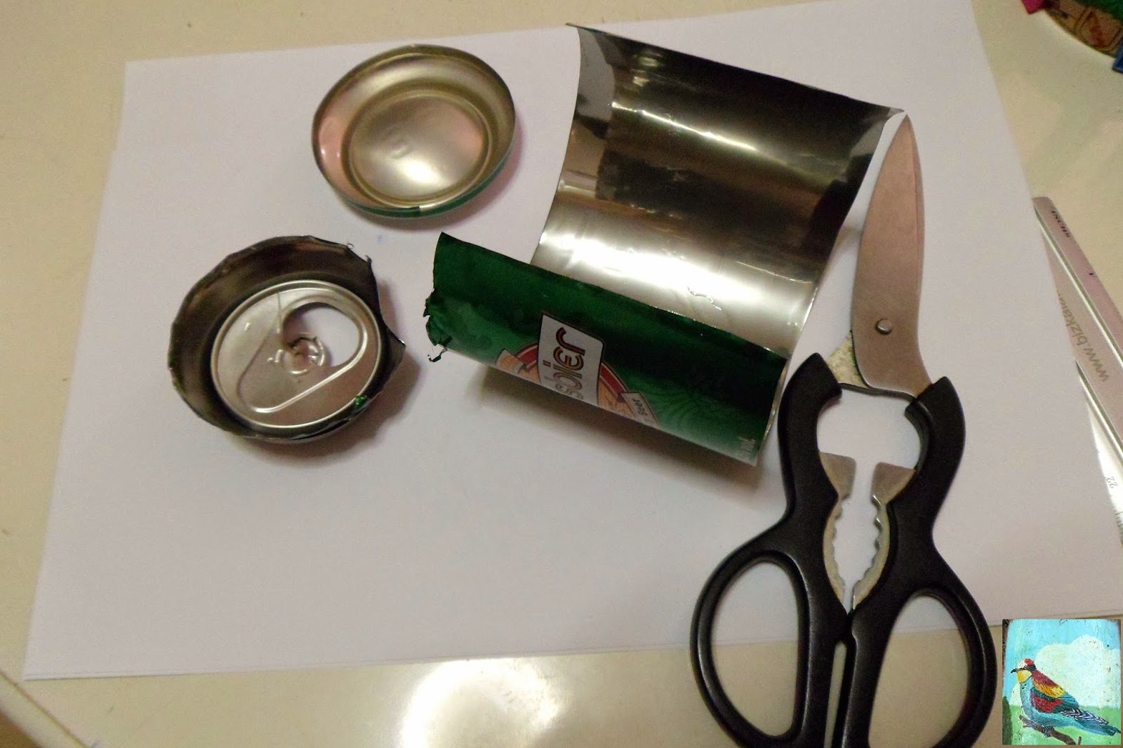 1. Tenemos que abrir la lata con las tijeras y la vamos cortando hasta quedarnos con unas tiras de 2,5 cms de ancho. Para cortarlas rectas medimos con la regla y señalamos con el rotulador. Con una lata deben salirnos unas 3 tiras.