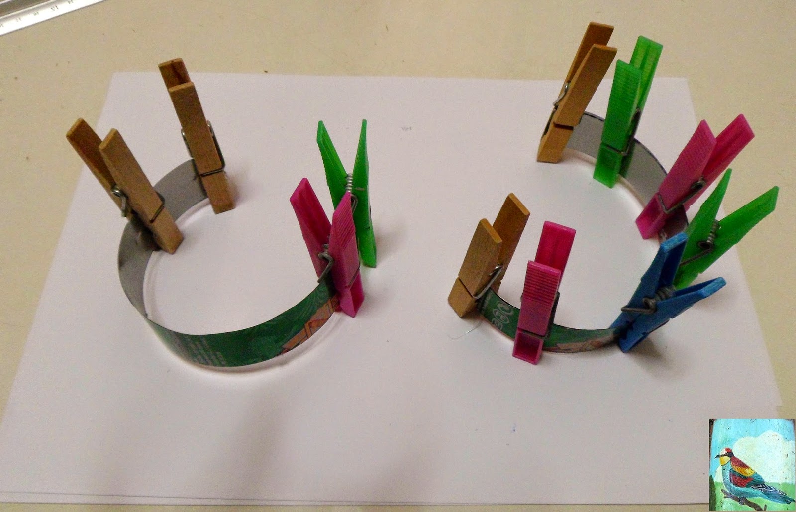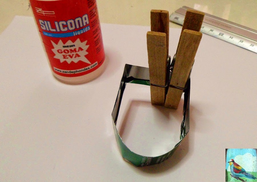 2. Para que quede más fuerte vamos a pegar dos tiras, así nos quedarán el doble de gruesas, y las sujetamos con unas pinzas hasta que sequen bien.