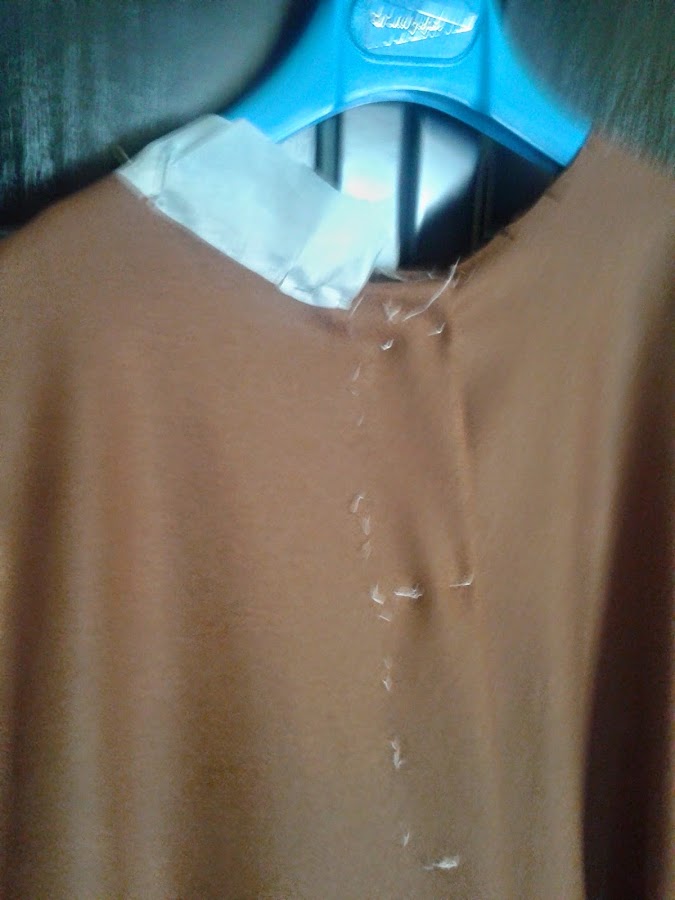 Muy sencillo, unimos la capa y el forro, cosiendo alrededor, todo menos el cuello, teniendo esmero que el forro sea igual o 1 cm más largo para que no tire. Damos piquetes en los hombros, zona curva y damos la vuelta por el cuello. Ahora medimos el cuello, alargamos o cortamos de la parte de detrás, según nuestra medida. Probamos el patrón con alfileres así: