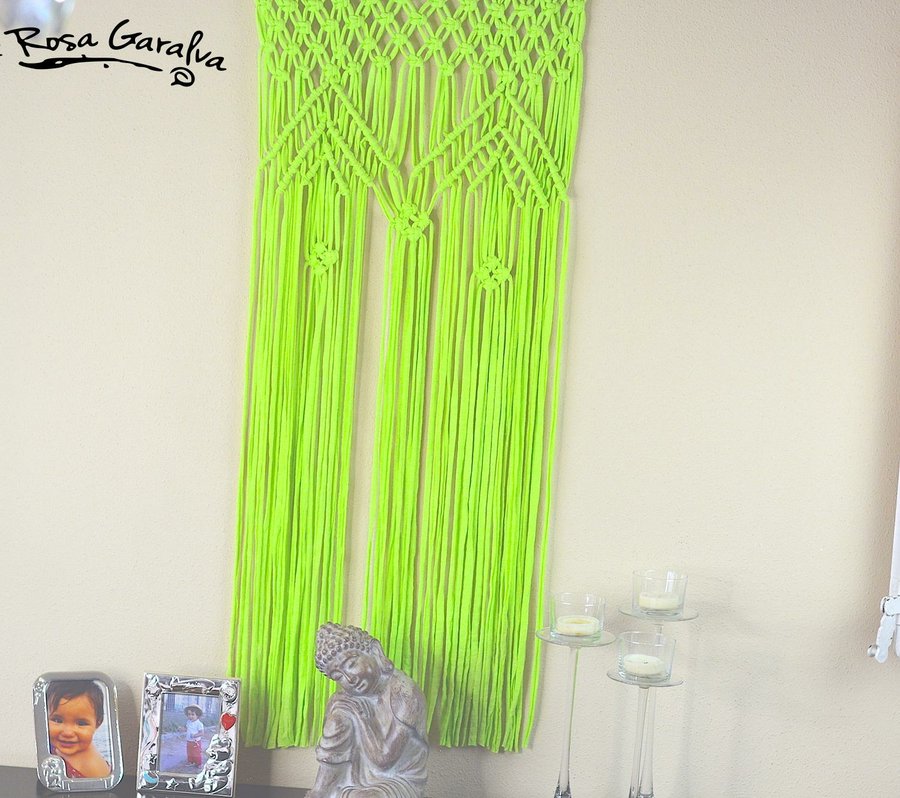 Hace tiempo qué tenía por casa un ovillo de trapillo, lo compré porque el color me pareció muy bonito pero luego ya no supe qué hacer con el...demasiado verde para una bufanda, pensé. Hasta qué hace unos día se me ocurrió qué podía hacer una cortina de macramé y aunque en realidad no la estoy usando como cortina, me ha quedado muy bonita en una pared en la qué no había puesto ningún cuadro, pues mi cortina ha quedado ideal para ese espacio.
