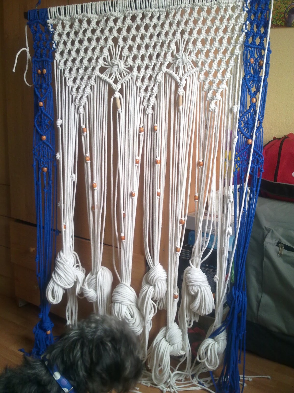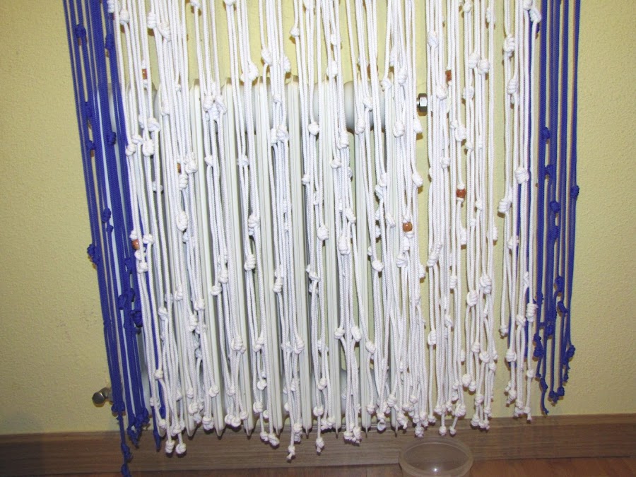Para hacer la cortina use rollos de cordón de algodón blanco y azul, cada rollo era de 100 metros y costaba 10 euros el rollo, en otra tienda me dijeron que el rollo costaba ¡60 euros!, y me deprimí un poco porque me hacían falta unos 8 rollos, hubiera sido totalmente inviable. La inversión total con las cuentas de madera fueron alrededor de 90 euros. Es una pasta pero hace ya dos años de eso y la cortina aguanta y se puede lavar en la bañera estupendamente, espero que dure por lo menos otros dos para que esté amortizada. La barra de la cortina es reciclada ya que usé el listón de madera de la antigua cortina, de 80 cm, consiste en un listón de madera con un par de arandelas justo donde van las alcayatas a la pared. Es aconsejable poner estas arandelas antes de empezar la labor por que despues es mas difícil marcar y hacer el agujero.