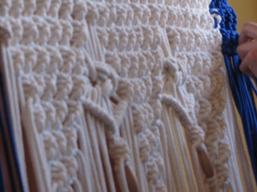 Corté el cordón blanco en 46 tiras de 8 m cada una, las del color azul no era necesario que fueran tan largas porque no llevaban tantos nudos, pero cuando empecé todavía no lo sabía. En los lados puse el cordón azul 7 tiras, en cada lado, para tener un total de 60 tiras que al enganchar a la madera dará lugar a 120 cabos de 4 m.