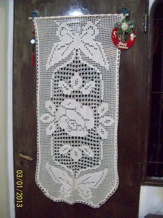 HOLA AMIGAS, LES CUENTO QUE ESTAMOS PINTANDO LAS ABERTURAS EN CASA Y NO TENIA CORTINA, SE ME OCURRIO HACERLE ESTA CORTINITA, ES UN CENTRO DE MESA EL GRAFICO QUE ELEGI...ME LLEVO TIEMPO PERO SE LUCE...AHORA HACIENDO UNA MAS DELGADA PARA EL VISILLO, EN CUANTO ESTE LO PUBLICO PARA UDS..BESOS