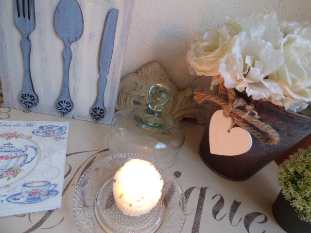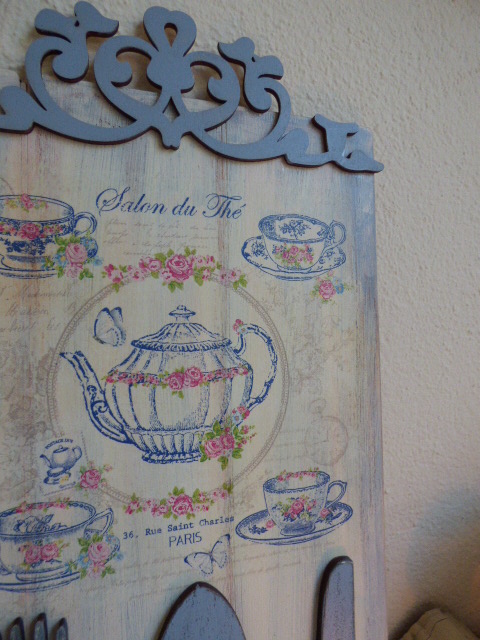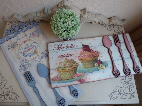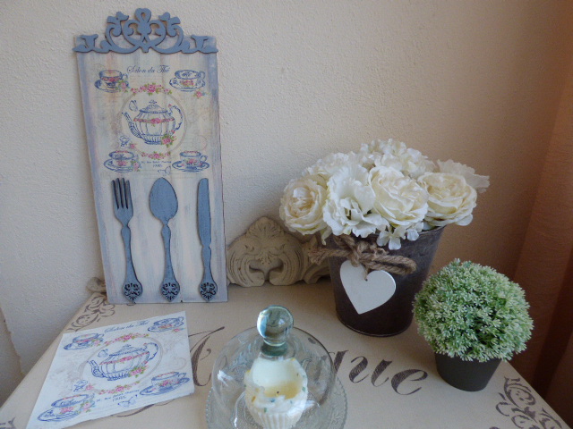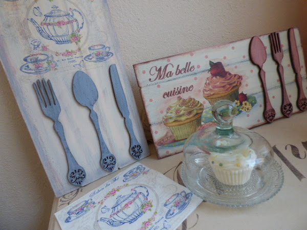 Con unos juegos de cubiertos y servilletas he hecho un par de cuadritos de cocina. Este, en tonos azules, añadiéndole un copete que decora tantisimo.