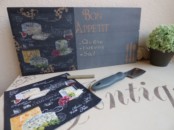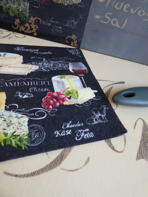 Tenía ganas de usar esta servilleta de fondo negro. Pensé que para que se integrara perfectamente con el fondo oscuro de la servi, lo mejor era pintar la madera sobre la que iba a ir, de color negro. No tuve en cuenta que los motivos de colores claros, o sea los quesos, iban a transparentar el color negro. Así que el resultado ha sido más "turbio" de lo que en realidad, es la servilleta