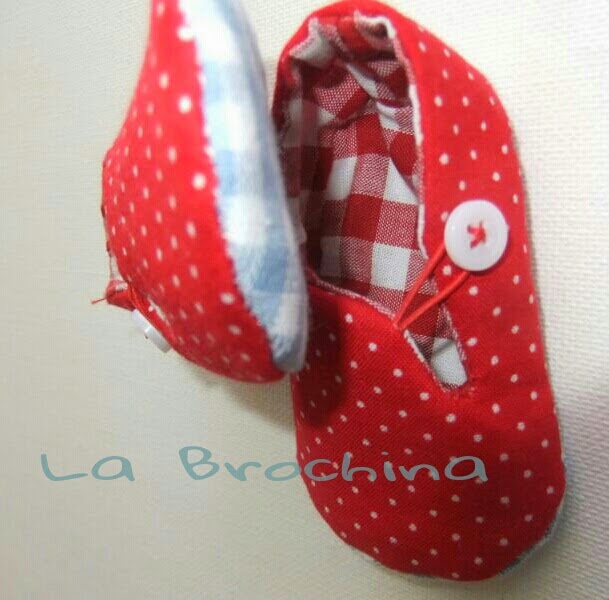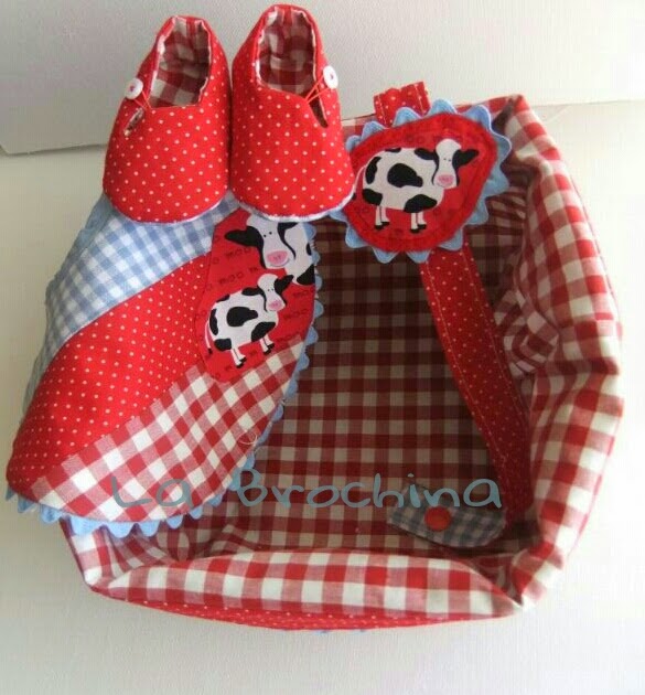 Eran mis primeros patucos de tela, a le segunda salieron bien, la cesta en arpillera forrada de vichi esta personalizada. Y todo realizado en vichi blanco y rojo combinando con topos blancos sobre rojo y vichiy zig zag en azul claro