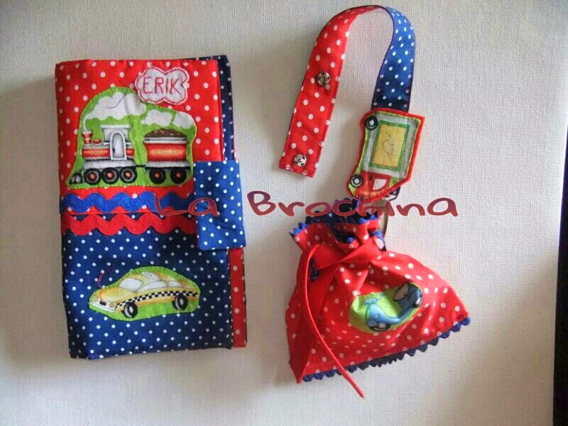 Este conjunto formado por funda para la cartilla sanitaria, chupetero y bolsita es para Erik,