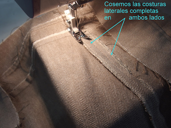 PASO 27: Para coser el dobladillo, vamos a hacer una costura que va desde la cinturilla, recorriendo toda la pieza. esto nos va a ayudar a sujetar las costuras y nos hace una costura decorativa a cada lado de la costura que une cada delantero con la parte trasera. Para ello, cosemos del revés usando como guía la costura central. Cosemos del tirón la costura que baja desde la cinturilla, el bajo y volvemos a subir de nuevo hasta la cinturilla. Esto lo repetimos en las tres pìezas principales de la falda (delantero y partes traseras).