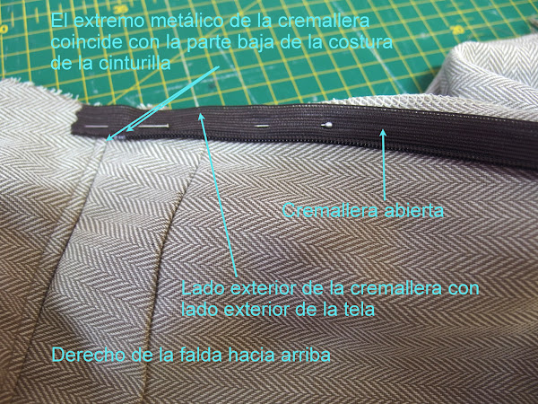 PASO 28: Ahora vamos a coser la cremallera invisible. Para ello, sujetamos la cremallera a la falda de la siguiente manera: Abrimos la cremallera y la colocamos sobre la falda, de manera que exterior de la cremallera coincida con el exterior de la pertura de la falda. El derecho de la falda tiene que estar hacia arriba, y el extremo metálico superior de la cremallera (el tope), debe coincidir con la costura central de la cinturilla.